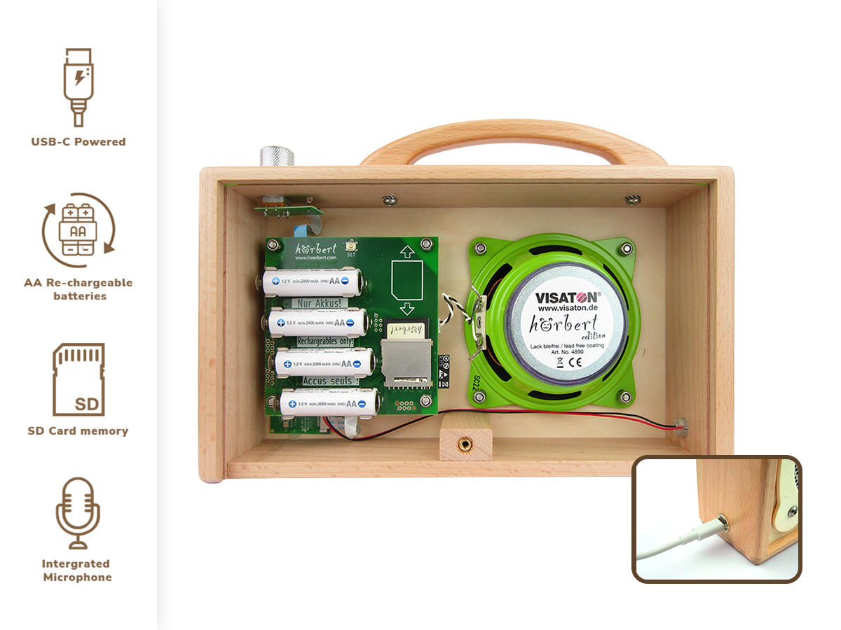 - hörbert is yours – no subscription, no licence fees, no restrictions. The SD card can be reloaded as many times as you like.