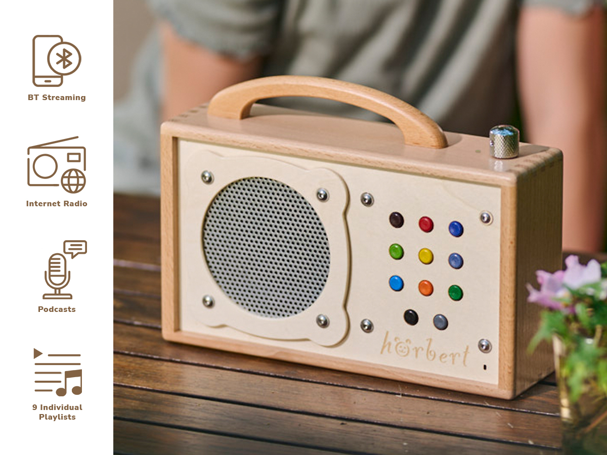 - You navigate through the playlists with a simple button press; hörbert remembers the exact position when switched off and resumes seamlessly when switched back on.