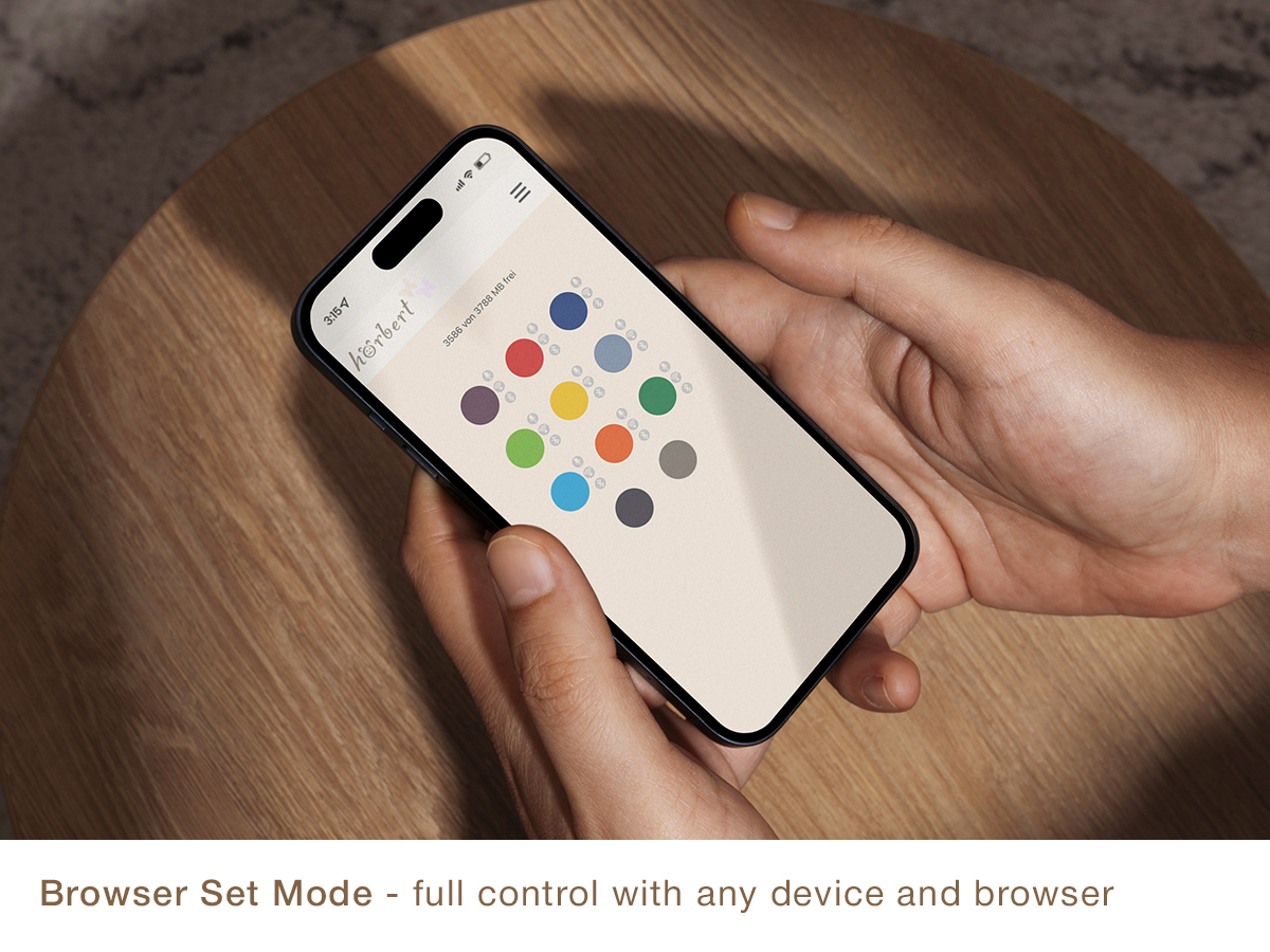 - You manage the playlists conveniently via web browser through hörbert’s own Wi-Fi – no app, no internet connection, no registration required.