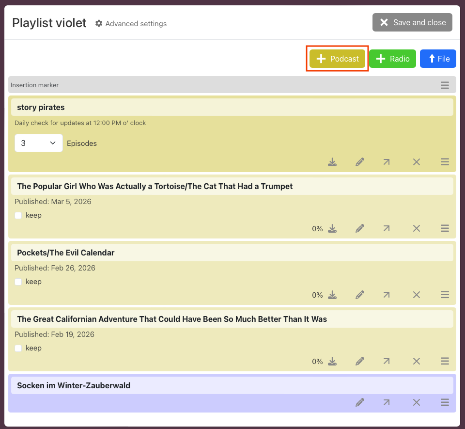 - After successful download, click on the grey ‘Save and close’ button in the top right-hand corner of the window to save the playlist.