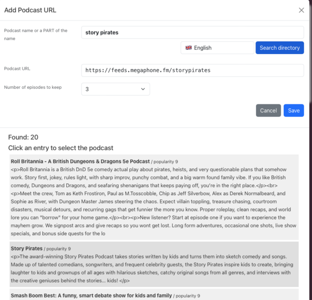 - Click on the blue ‘Save’ button. The podcast’s control file will now be added to the playlist.