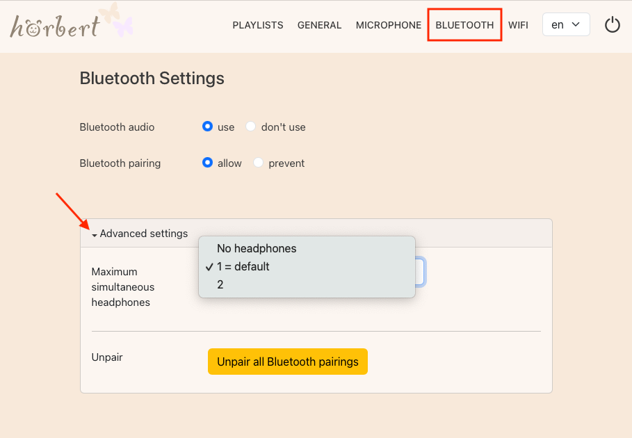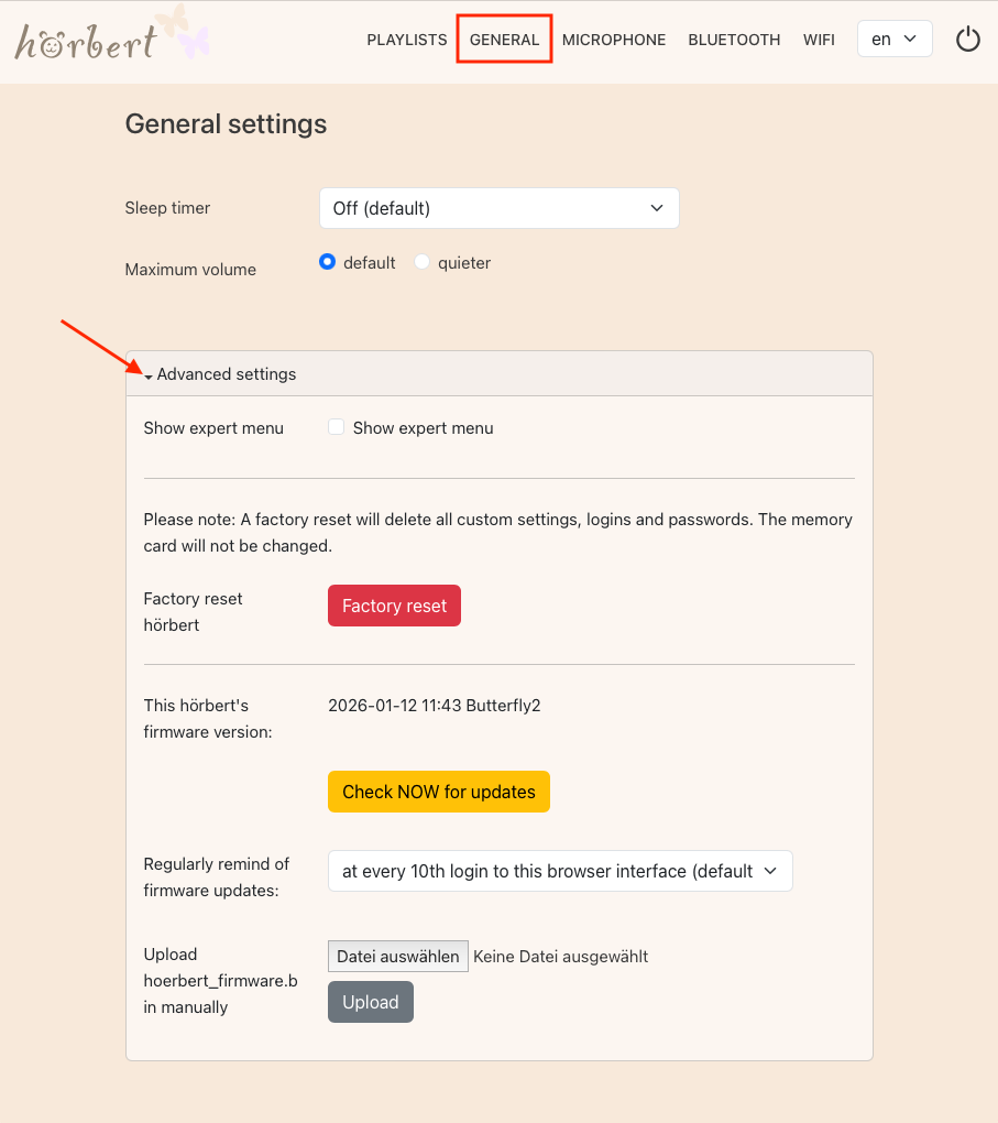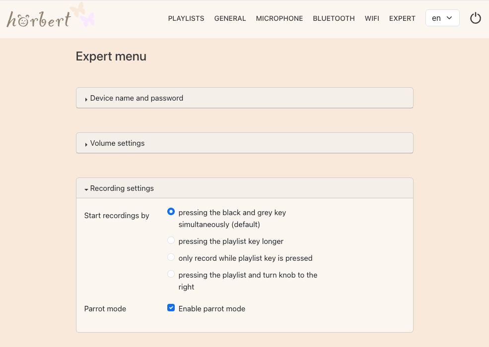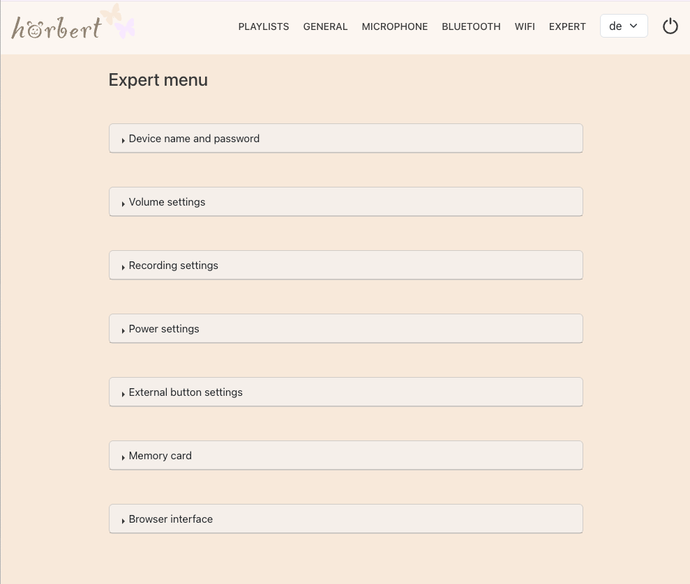 Additionally, hörbert has many advanced features that can be activated via a web interface, the Browser Set Mode (9.1). Among other things, it can be used as a Bluetooth speaker (9.6.4), podcast-player (9.4) or a webradio player (9.3.7). Thanks to the recording functions (8) für voice, Bluetooth streams and internet radio streams, there are no ongoing costs for new audio content. With the sleep timer function (9.2.1) hörbert gently accompanies you to sleep. hörbert is delivered with a preloaded memory card, so listening fun can begin immediately. The memory card can be expanded at any time with your own content (5.6).